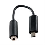 Adaptern har en kabellängd på 12,5 cm och har en mini USB-kontakt i ena änden och en 3,5 mm-kontakt i andra änden.