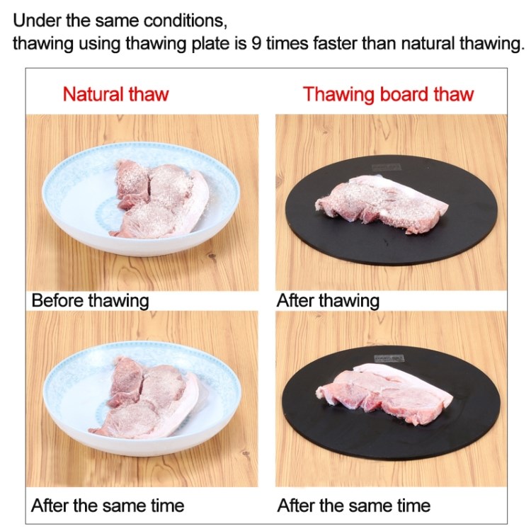 Avfrostningsbrickans höga, inbyggda värmeledningsförmåga minskar avfrostningstiden för maten med upp till fyra gånger utan användning av el, mikrovågsugn eller kemikalier.