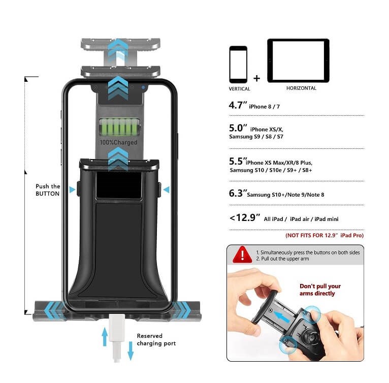 Passar iPhone 7/8/X/11/11 Pro/Max/12/12 Pro/Max och andra smartphones med 5,5-tums skärm samt iPad Pro 11, 12,9, iPad 1/2/3/4/5/6, iPad Air 2/3/4, Nexus 7, Samsung Galaxy Tab 10/J/S3, Kindle och andra surfplattor med 5,5" till 12,9" skärm.